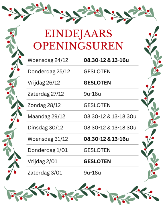 Tussen 12.00u en 13.00u sluiten wij even de deuren, behalve op zaterdag.