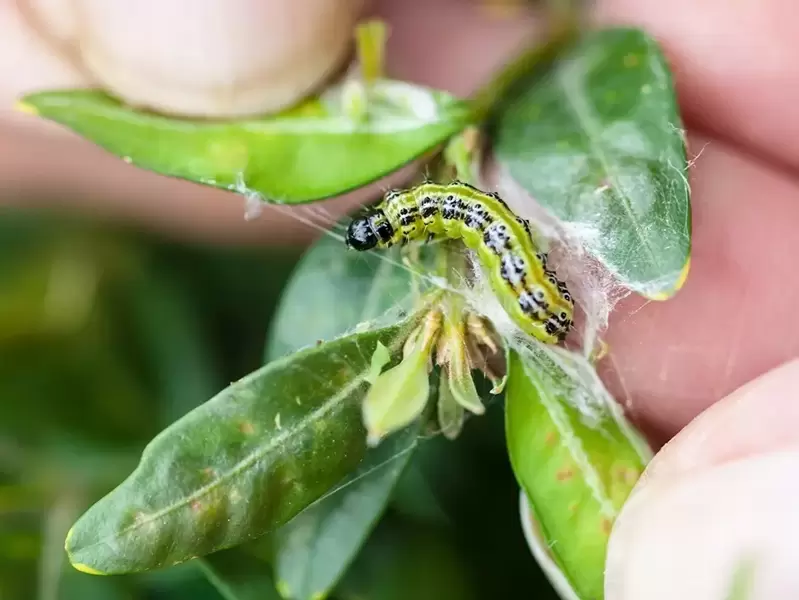 De buxusmot veroorzaakt in tal van landen een enorme kaalslag. De rupsen van de buxusmot, een zwart-witte Aziatische nachtvlinder die hier met een lading geïmporteerde, geïnfecteerde buxussen terecht is gekomen, kunnen een buxusstruik in korte tijd kaalvreten. Ze zijn moeilijk te zien, want ze zitten onder de buitenste bladeren verstopt. Het eerste wat je zal opvallen is dat er kale plekken in de buxus ontstaan, met aan de voet daarvan ‘fijngemalen’ blaadjes. Controleer je buxussen daarom regelmatig en voel met je vingers tussen de takken of je een plakkerige substantie en spinsels tegenkomt. Daarin zitten de felgroene rupsen met een zwarte kop en zwarte stippen. Ze slaan vooral eind april, begin mei en in augustus toe. Bestrijd de rupsen door ze met de hand te verwijderen of met biologische middelen, die verkrijgbaar zijn in ons tuincentrum in Gistel. Geef je buxus daarnaast regelmatig speciale buxusvoeding.